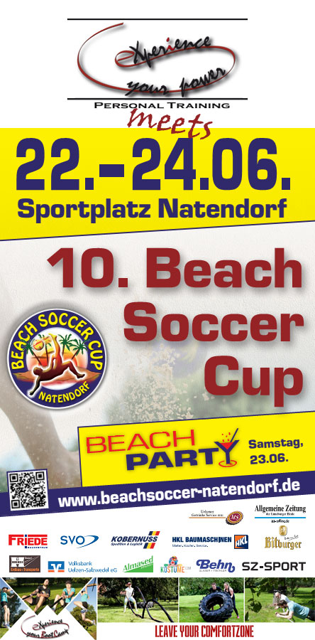 Auch in diesem Jahr kommen wieder alle Fitnessbegeisterten voll auf ihre Kosten. eXperienceyourpower – Personal Training ist wieder mit am Start. Wie im letzten Jahr dreht sich hier alles um Sport und Fitness. Es wird wieder einen Fitnessparcours geben. Aber das ist noch nicht Alles! Zum 10. Jubiläum vom Beach-Soccer-Cup in Natendorf hat sich eXperienceyourpower etwas Besonderes zur Aufgabe gemacht: Mini Bootcamps. Hier kann sich jeder 20 min. lang im Gruppenworkout voll auspowern. Als i-Tüpfelchen wird es bei eXperienceyourpower auch ein Soccer Bootcamp geben. Darüber hinaus wird es exklusiv auch Ladies Bootcamps mit Iza geben: eXperienceYourBoot.Camp! Jeder ist herzlich willkommen teilzunehmen. Vergesst nicht Eure Sportklamotten einzupacken!
